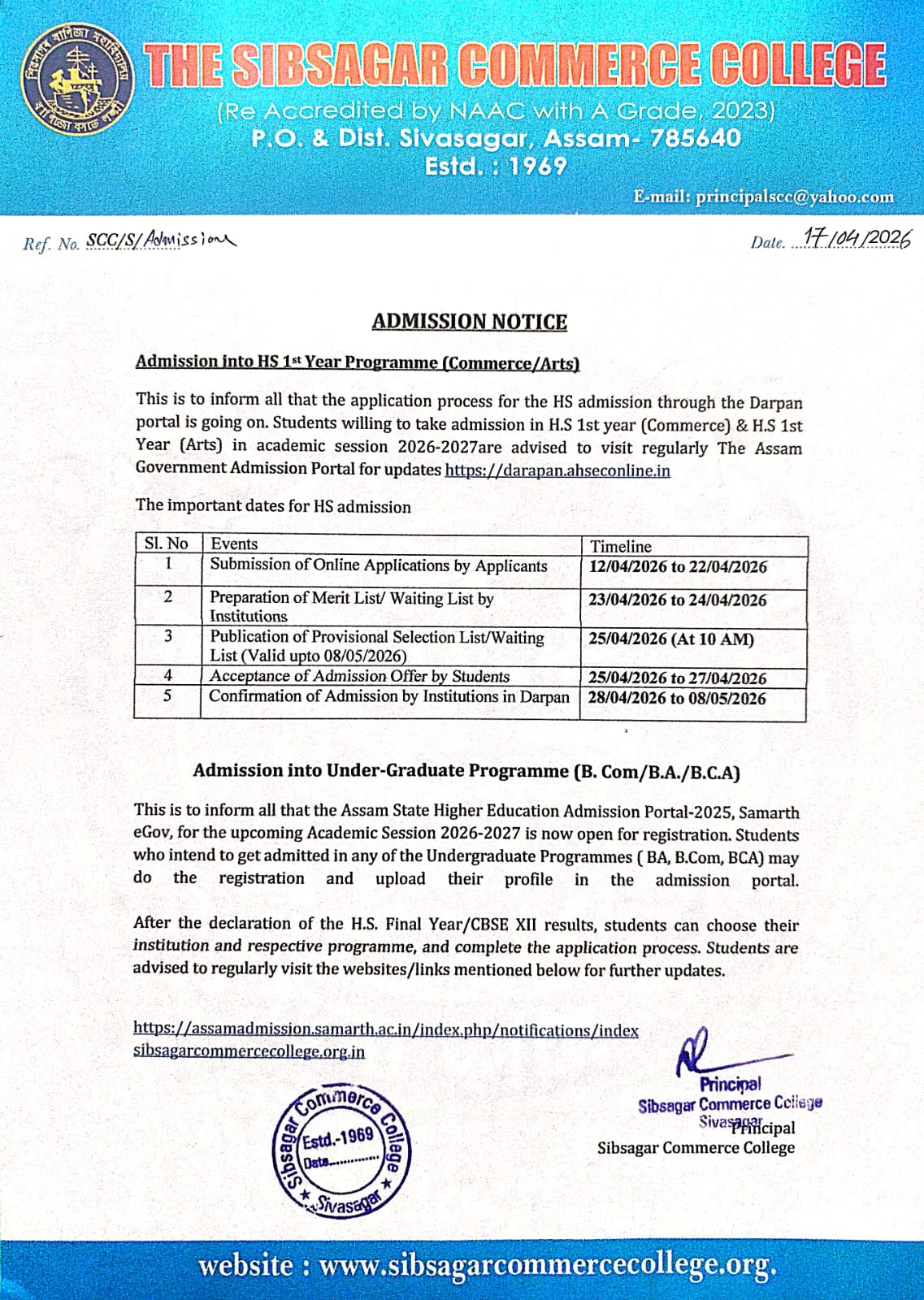 This is to inform all that the application process for the HS admission through the Darpan portal is going on. Students willing to take admission in H.S 1st year (Commerce) & H.S 1st Year (Arts) in academic session 2026-2027are advised to visit regularly The Assam Government Admission Portal for updates https://darapan.ahseconline.in