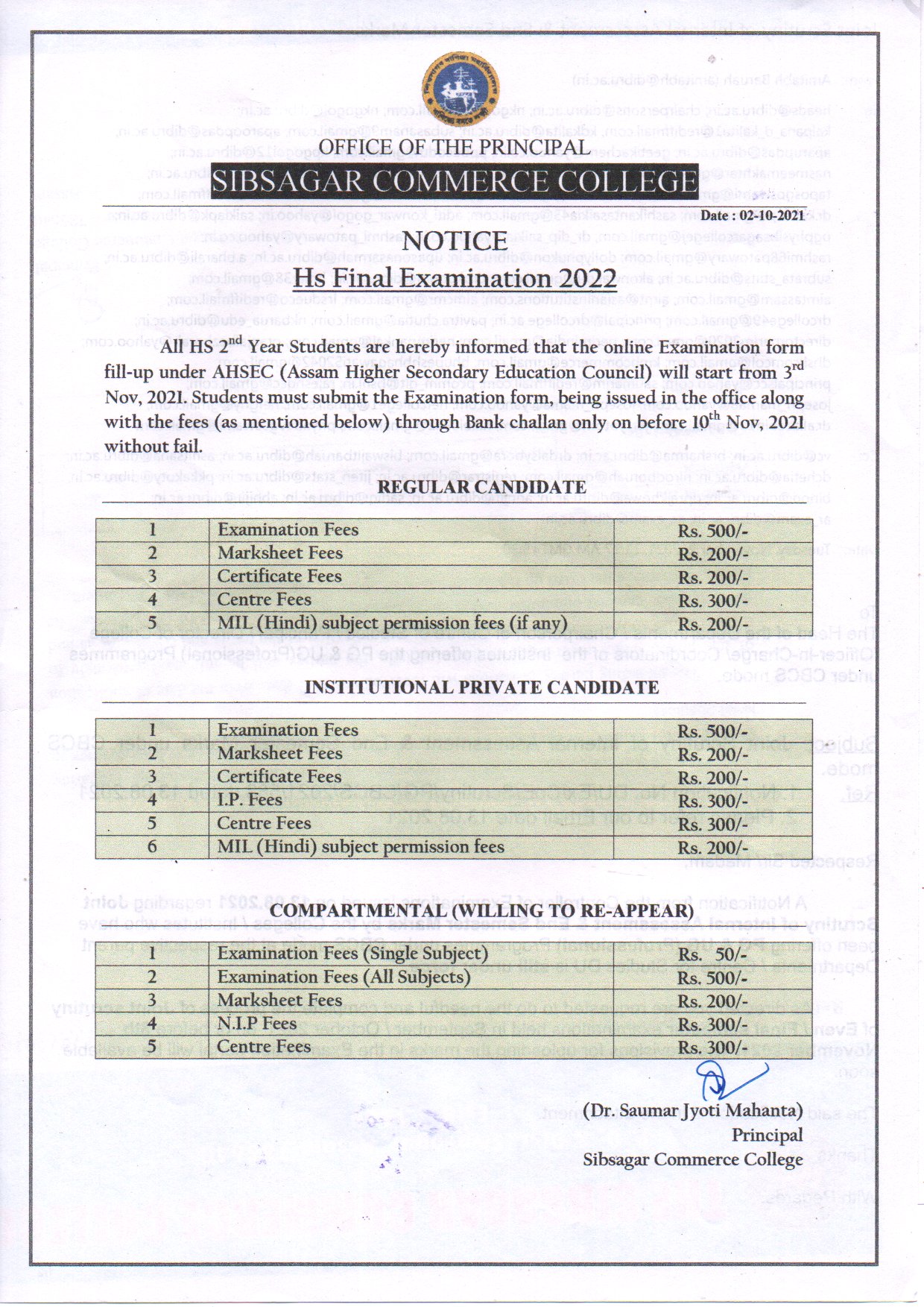 All HS 2nd Year Students are hereby informed that the Examination form fill-up under AHSEC (Assam Higher Secondary Education Council) will start from 3rd Nov, 2021. Students must submit the Examination form, being issued in the office along with the fees (as mentioned in the attached file) through Bank challan only on before 10th Nov, 2021 without fail.